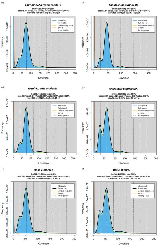 GenomeScope 2.0 profile plots for botiid fishes. (a,b) were based on data (NCBI BioProject accession #: PRJNA1257825) generated in the current study. (c–f) were based on data (NCBI BioProject accession #: PRJNA1067307) obtained by Bitsikas et al. (2024) [17]. For (b), the “average k-mer coverage” was set as 50 based on preliminary results. For other samples, this parameter was set as default (−1).