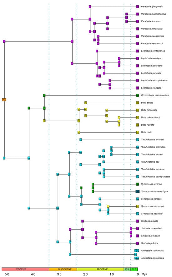 The DIVALIKE + J model inferred a long-distance dispersal event from Maritime Southeast Asia (B) to South Asia and Myanmar (C) along the branch leading to Chromobotia and Botia (Figure 6). This inference is based on the sister relationship between Chromobotia—which is currently distributed in Sumatra and Borneo—and Botia, which occurs in South Asia and Myanmar. This dispersal likely took place during the late Eocene (Figure 6). Although the model did not explicitly reconstruct the route, we propose that the dispersal may have occurred via the nearby Malay Peninsula, which could have served as a stepping stone. We agree with Šlechtová et al. (2006) that Chromobotia and Botia might once have had a broader and continuous distribution [17].