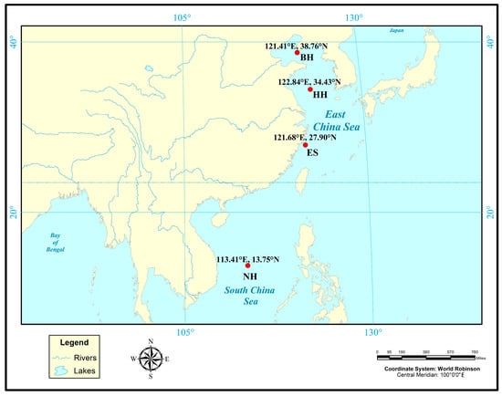 In this study, the selected populations were obtained from different generations of strains selected, and the first, second, and third generations of the selected P. argenteus through continuous mass selection were named ES-G1, ES-G2, and ES-G3, respectively. Their daily management and feeding techniques were based on the previous research [22,23]. Hydrological parameters included daily water renewal rates of 100–220% with sustained microcurrent conditions, dissolved oxygen stabilized at 7 mg/L, and salinity maintained at 25 ppt. Thermal regulation-maintained water temperature between 15–28 °C, with parallel pH monitoring at 7.8–8.2. Nutritional provisioning followed a daily feeding regime equivalent to 3–4% of cohort biomass. Given the species’ documented photophobic behavior, diurnal photoperiod regulation was implemented using programmable LED arrays: 100 lx (06:30), 200 lx sustained from 10:30–16:30, stepped reduction to 50 lx (16:30–22:30), and nocturnal dimming to 5 lx post-22:30. Additionally, the wild populations were artificially captured by fishing vessels. The specific fishing populations were as follows: Bohai Sea (BH), Yellow Sea (HH), East China Sea (ES-G0), and South China Sea (NH) wild populations, and the coordinate information is shown in Figure 1. Forty individuals were randomly selected from each population. Muscle tissues were dissected from fresh specimens, preserved in 98% ethanol, and stored frozen at −20 °C until DNA extraction. The total genomic DNA from each sample was extracted from 30 to 50 mg of muscle tissue using the phenol-chloroform method [24]. The concentration of DNA was determined using a spectrophotometer. High-quality DNA was diluted to 50 ng/mL and stored at −20 °C.