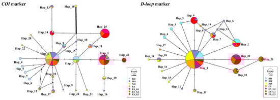 Median-joining (MJ) networks of wild and mass-selected populations of P. argenteus based on mitochondrial COI and D-loop markers.