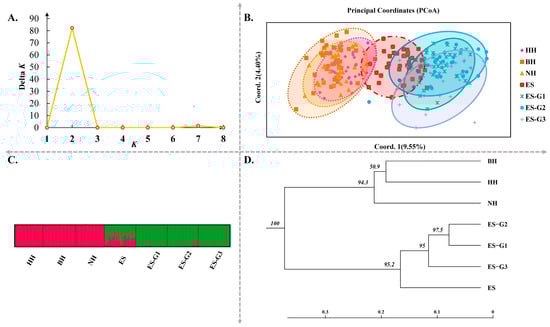 The molecular analysis of variance (AMOVA) revealed these differences were observed between wild populations and between selected populations, with a significance level of p < 0.05 (Table 3). Additionally, the genetic differentiation coefficients between wild populations (excluding the ES population) and selected populations were significantly higher than those observed between selected populations (ranging from 0.0376 to 0.1052) and between wild populations. The trend of these results was basically consistent with the analysis results based on mtCOI and mtD-loop molecular markers (Table S6). The PCoA based on the genetic distance matrix further revealed the genetic relationships between populations and individuals (Figure 3B). The HH, BH, and NH populations were found to be closely overlapped, and similarly, the ES-G1, ES-G2, and ES-G3 populations were also determined to be closely overlapped. Coordinate axis 1 (9.55%) and coordinate axis 2 (4.40%) were able to clearly distinguish these two overlapping regions. It was observed that the ES population overlapped within both of these major regions, which confirmed the high genetic similarity between the ES population and the overlapping regions (Figure 3B). During the cluster analysis of these seven populations, the studied samples were optimally divided into two theoretical groups due to the highly significant peak in the Δ K parameter curve at K = 2. The genetic composition of each cluster was clearly divided, and the degree of genetic mixing at the individual level was found to be very low (Figure 3A,C). It was established that there was a high level of mixing between wild individuals and between selected individuals, leading to their classification into two clusters.