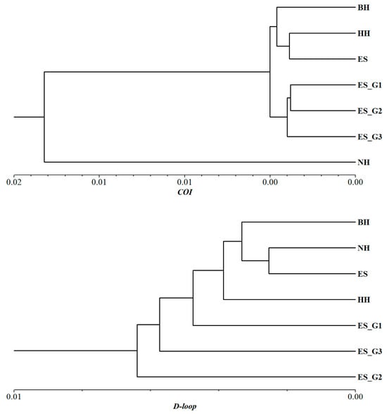 In order to further understand the relationships among different populations, UPGMA phylogenetic trees were constructed based on Nei’s unbiased genetic distance (Figure 3D and Figure 4). The topological structure of the tree based on microsatellite markers revealed that the seven populations were clustered into two major branches. The wild populations BH, HH, and NH were placed on one separate branch of the clustering tree, while the three consecutive generations of selected populations, along with the ES population, were clustered on another branch. Furthermore, the selected populations were further subdivided into three branches based on the selected strain. At the same time, it was observed that the differentiation between adjacent generations in three consecutive generations of selected populations became increasingly evident. Similar conclusions were also confirmed by the results of PCoA. The topological structure of the UPGMA tree based on mtCOI was similar to that of microsatellite markers. However, the topological structure based on mtD-loop molecular marker found that the wild population was still clustered first, and then the selected population gradually gathered with them into a large group.