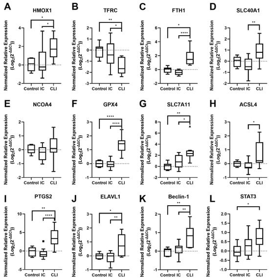 To investigate whether ferroptosis was occurring in the skeletal muscle of both IC and CLI PAD patients, we used qPCR to quantify the expression of ferroptosis-related RNA (Figure 1). The most notable results among the iron metabolism-related genes are the significant increase in HMOX1 expression as PAD progresses (p = 0.0145; Figure 1A) and the corresponding significant decrease in TFRC expression (p = 0.0095; Figure 1B). Additionally, the expression levels of FTH1 (p = 0.0008; Figure 1C) significantly increased in CLI patients, while SLC40A1 (Figure 1D) trended upwards in CLI patients (p = 0.0911) when compared to controls but only showed a significant difference between IC and CLI patients (p = 0.0049). NCOA4 did not show a strong trend in either direction (Figure 1E). We also examined genes involved in glutathione metabolism, GPX4 and SLC7A11. The expression of both GPX4 (p < 0.0001; Figure 1F) and SLC7A11 (p = 0.0018; Figure 1G) was significantly increased in CLI patients. Similarly, PTGS2 (p < 0.0001; Figure 1I) was significantly upregulated in CLI patients, while ACSL4 (Figure 1H) showed a strong trend upwards in CLI patients when compared to controls (p = 0.0939) but only showed a significant difference between IC and CLI patients (p = 0.0154). Additionally, we observed upregulation of autophagy-related genes ELAVL1 (p = 0.0235; Figure 1J) and BECN1 (p = 0.0018; Figure 1K) in CLI patients. The inflammation-related gene STAT3 was also significantly upregulated (p = 0.0268; Figure 1L) in CLI patients. These results suggest that changes in gene expression related to iron metabolism, glutathione metabolism, autophagy, and inflammation may be associated with severe PAD myopathy and potentially indicative of ferroptosis occurring in skeletal muscle tissue.