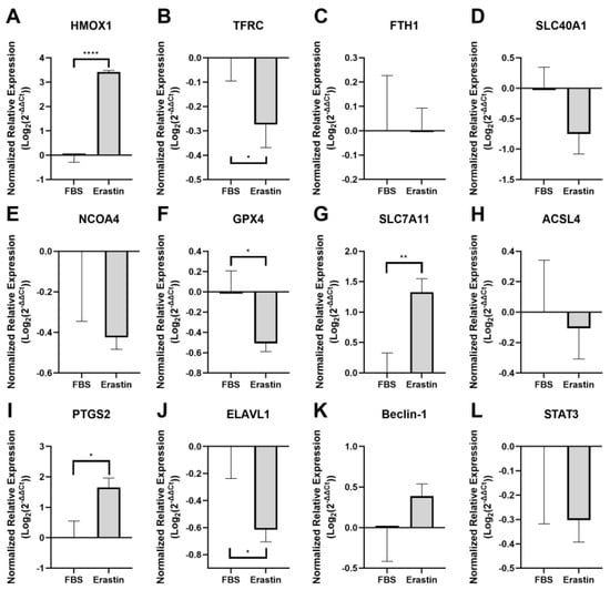 Comparing the expression of autophagy-related genes, ELAVL1 was significantly downregulated in erastin myotubes (p = 0.0137; Figure 2J), which contradicts our findings in CLI patients, whereas BECN1 showed a trend of upregulation that was not statistically significant (p = 0.2024, Figure 2K). Lastly, the inflammation-related gene STAT3 exhibited a negative trend in expression in erastin myotubes, though this trend was not statistically significant (p = 0.1882; Figure 2L). These findings suggest that there is an overlap in the expression of some ferroptosis-related genes in the erastin-treated myotube model and PAD skeletal muscle tissue; however, there are also key differences.