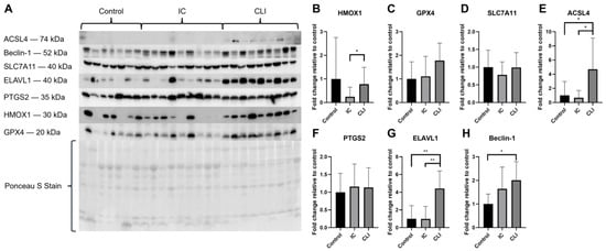Protein expression in the muscle tissue of IC and CLI PAD patients. (A) Western blot results for HMOX1, GPX4, SLC7A11, ACSL4, PTGS2, ELAVL1, and Beclin-1, with a representative Ponceau S stain. Graphs depict the fold change relative to control for (B) HMOX1, (C) GPX4, (D) SLC7A11, (E) ACSL4, (F) PTGS2, (G) ELAVL1, and (H) Beclin-1 protein expression. Control n = 7, IC n = 9, CLI n = 9 for all graphs. * p < 0.05, ** p < 0.01.