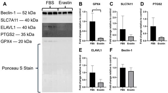 Protein expression in cultured myotubes treated with either FBS or erastin. (A) Western blot results for GPX4, SLC7A11, PTGS2, ELAVL1, and Beclin-1, with a representative Ponceau S stain. Graphs depict the fold change relative to control for (B) GPX4, (C) SLC7A11, (D) PTGS2, (E) ELAVL1, and (F) Beclin-1 protein expression. FBS n = 3, erastin n = 3 for all graphs. * p < 0.05.