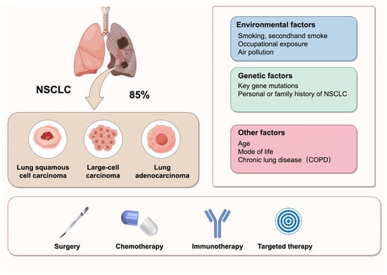Classification, influencing factors, and treatment strategies of NSCLC. NSCLC is the most prevalent type of lung cancer, accounting for 85% of all cases. It primarily comprises three histological subtypes: lung squamous cell carcinoma, large-cell carcinoma, and lung adenocarcinoma. The pathogenesis of NSCLC is multifactorial, involving environmental exposures, genetic predispositions, and other contributing factors. The current treatment strategies for NSCLC include surgery, chemotherapy, immunotherapy, and targeted therapy.