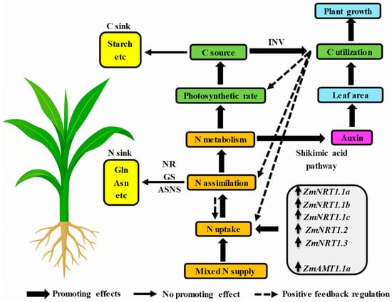 - Wang, P.; Wang, Z.; Pan, Q.; Sun, X.; Chen, H.; Chen, F.; Yuan, L.; Mi, G. Increased biomass accumulation in maize grown in mixed nitrogen supply is mediated by auxin synthesis. J. Exp. Bot. 2019, 70, 1859–1873. [Google Scholar] [CrossRef]