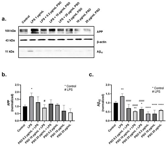 Bacterial LPS affect key physiopathological aspects of AD, such as Aβ regulation, tau protein abnormalities, neuroinflammation, and neurodegeneration [40]. Consequently, are often employed to stimulate neuroinflammation and mimic AD-like characteristics [41]. For that reason, N2a cells were pre-treated with PSO (0.2 μg/mL, 10 μg/mL, and 25 μg/mL) for 4 h, and subsequently they were exposed to 1 μg/mL of LPS for 24 h. LPS increased by 1.7-fold the levels of APP, compared to the control (p = 0.0275; Figure 1a,b) and the levels of Aβ42 by 1.4-fold compared to the control (p = 0.0034; Figure 1a,c). The addition of 10 μg/mL of PSO in N2a cells reduced the LPS-induced amyloid exacerbation (−80%, p = 0.0119 for APP; −88%, p = 0.0004 for Aβ42). Treatments with PSO in the absence of LPS had no statistically significant effect on APP. Besides, Aβ42 levels were reduced with all PSO treatments compared to control (p < 0.0001) (Figure 1b,c).