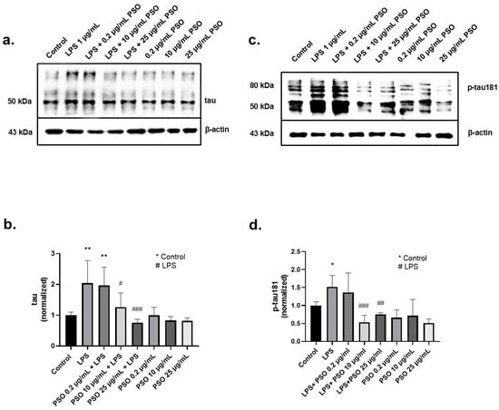 AD is closely related to the overexpression of tau and p-tau181. The tau protein levels were determined after 24 h of exposure to PSO, in the presence or absence of LPS. As shown in Figure 2a, LPS induced an increase of 2.0-folds in tau levels (p = 0.0049; Figure 2b), compared to baseline levels. The effect of LPS was mitigated by PSO in a concentration-dependent manner, with 25 μg/mL being the most effective concentration reducing p-tau181 levels to −124% (p = 0.0010).