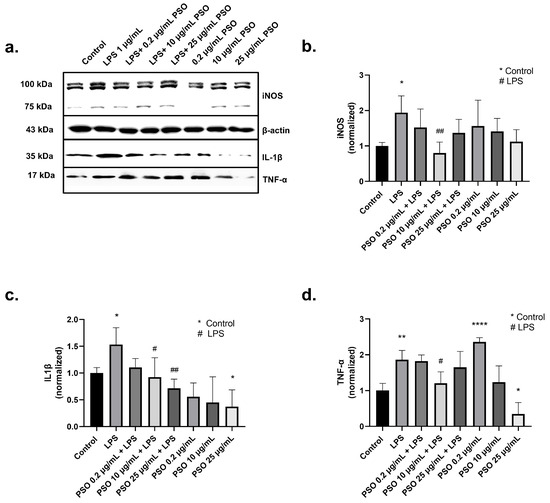 iNOS is regarded as one of the key molecular mediators of LPS-related inflammation and iNOS levels are elevated during inflammation [42]. Treatment of N2a cells with 1 μg/mL LPS caused a statistically significant increase by 1.94-fold in the expression of total iNOS compared to control samples (p = 0.0180; Figure 3a,b). However, in the presence of PSO, iNOS levels were reduced in comparison to LPS-treated cells (Figure 3b), with the most intense reduction observed by 10 μg/mL of PSO (−114%, p = 0.0056; Figure 3a,b).