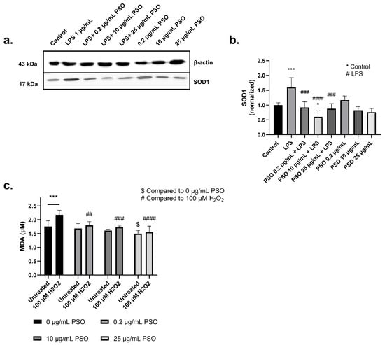 To further explore the antioxidant activity of PSO, the oxidative status of cells challenged with H2O2 in the presence or absence of PSO was also evaluated via the determination of the peroxidation marker MDA (Figure 4c). As anticipated, MDA levels increased by 23.8% in cells challenged with H2O2 (p = 0.0006), while PSO at all employed dosages (0.2, 10 and 25 μg/mL) inhibited this effect (−13.8%, p = 0.0010; −20.3%, p = 0.0003; −28.8%, p < 0.0001; respectively). Surprisingly, PSO at 25 μg/mL also lowered the basal MDA levels, in comparison to the control culture (−14.8%, p = 0.0133). These results further demonstrate the antioxidant capacity of PSO.