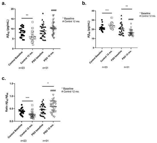 Levels of (a) amyloid peptide 1-42 (Aβ42), (b) amyloid peptide 1-40 (Aβ40) determined by ELISA, and (c) the ratio Aβ42/Aβ40 (Aβ42/Aβ40) in blood sera from patients with MCI who did not receive PSO (Controls) (n = 31) at the beginning and at the end of the trial compared to MCI patients who received no pharmacological therapy with PSO (n = 31). Results are provided with individual values scatter plots as mean values ± standard deviation (SD). (c) The calculation of the ratio Aβ42/Aβ40. All samples were analyzed at least in duplicate. Statistical analyses were performed with GraphPad Prism 8.0 statistical software. A t-test was used to examine possible differences between groups. * p < 0.05; ** p < 0.01, *** p < 0.001, with (*) indicating differences between 12 mo. and baseline levels. #### p < 0.0001, with (#) indicating differences between follow-up (12 mo.) levels of the Control and PSO groups.