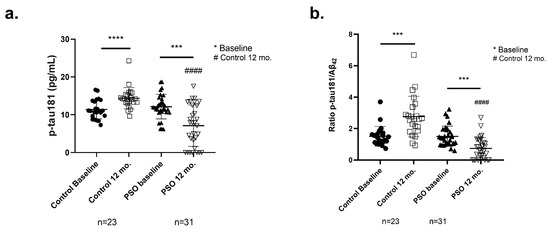 Levels of (a) tau protein phosphorylated at Threonine-181 (p-tau181) and (b) of the ratio p-tau181/Aβ42 as measured from the implemented ELISA on patients with MCI who did not receive PSO (Controls) (n = 31) at the beginning and at the end of the trial compared to MCI patients who received non-pharmacological therapy with PSO (n = 31) at the beginning and at the end of the trial as well. Results are provided with individual values scatter plots, which show mean values ± standard deviation (SD). All samples were analyzed at least in duplicate. Statistical analyses were performed with GraphPad Prism 8.0 statistical software. A t-test was used to examine possible differences between groups. *** p < 0.001, **** p < 0.0001, with (*) indicating differences between 12 mo. and baseline levels. #### p < 0.0001, with (#) indicating differences between follow-up (12 mo.) levels of the Control and PSO groups.