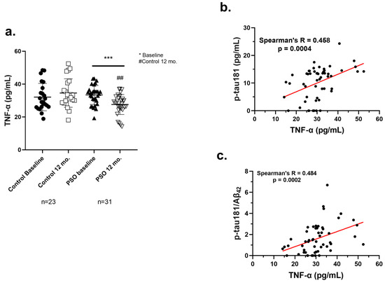 To further demonstrate the anti-inflammatory potential of PSO consumption in MCI patients, a correlation analysis was performed between the levels of TNF-α and the other biomarkers, determined at the beginning of the study and 12 months later, by the end of it. The analysis demonstrated that the levels of TNF-α correlate in a positive, linear manner with the levels of p-tau181 (Figure 7b) and the crucial ratio p-tau181/Aβ42 (Figure 7c) (Spearman’s R = 0.458, p = 0.0004; 0.484, p = 0.0002, respectively). The outcome of this analysis implies that the mitigation of inflammatory responses by PSO consumption demonstrated by the reduction of TNF-α, may be reflected in an improved amyloid-tau pathology in MCI patients.