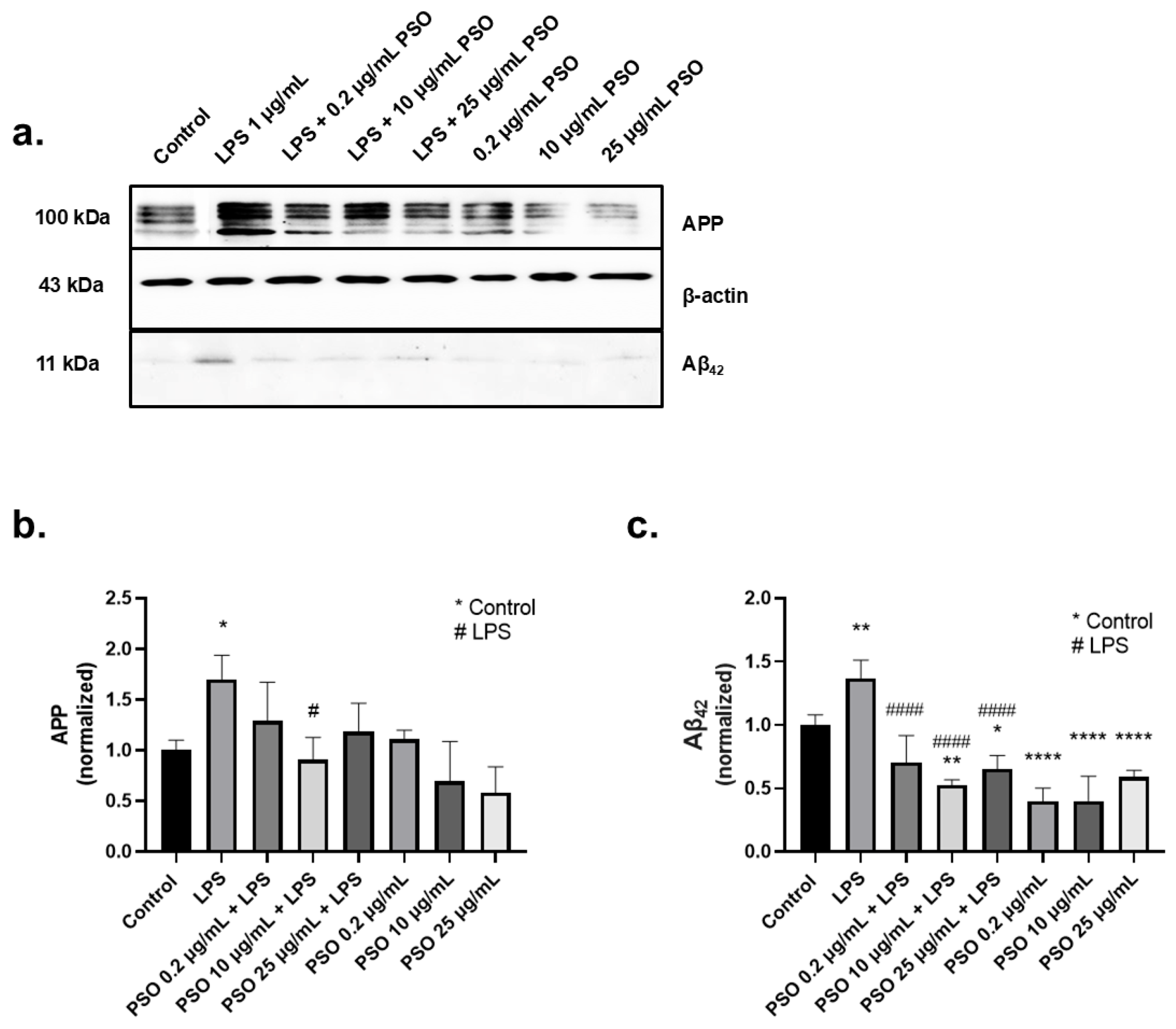 Effects of PSO on APP and Aβ42 levels in N2a cells challenged with LPS. (a) Representative Western blot images showing the levels of APP and Aβ42 in N2a cells treated with 1 μg/mL LPS in the absence or presence of PSO at varying concentrations (0.2, 10, and 25 μg/mL) (see Supplementary Material Section S1.1). (b) Quantification of APP levels normalized to β-actin. (c) Aβ42 levels normalized to β-actin. Data are presented as mean ± SD from three independent experiments. Statistical significance: * p < 0.05; ** p < 0.01; **** p < 0.0001, with asterisk (*) indicating the comparison versus control group; # p < 0.05; #### p < 0.0001, with (#) indicating the comparison with the LPS-treated group.