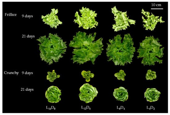 Morphology of lettuces (cv. Frillice and Crunchy) in response to different light/dark cycles on days 9 and 21 after transplanting in the LED plant factory. L16D8, 16 h light/8 h dark; L12D6, 12 h light/6 h dark; L8D4, 8 h light/4 h dark; L4D2, 4 h light/2 h dark.