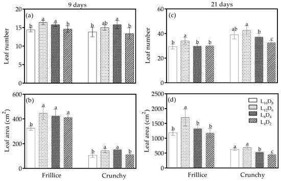 Leaf number (a,c) and leaf area (b,d) of lettuces (cv. Frillice and Crunchy) in response to different light/dark cycles on days 9 and 21 after transplanting. Different letters for the same parameter indicate significant differences at the 5% level, according to Duncan’s multiple range test (n = 5).