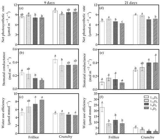 Net photosynthetic rate (a,d), stomatal conductance (b,e), and water use efficiency (c,f) of lettuces (cv. Frillice and Crunchy) in response to different light/dark cycles on days 9 and 21 after transplanting. Different letters for the same parameter indicate significant differences at the 5% level, according to Duncan’s multiple range test (n = 5).