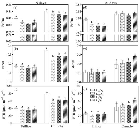 Dark-adapted maximal Photosystem II (PSII) efficiency (Fv/Fm) (a,d), PSII photochemical efficiency (ΦPSII) (b,e), and electron transport rate through PSII (ETR) (c,f) of lettuces (cv. Frillice and Crunchy) in response to different light/dark cycles on days 9 and 21 after transplanting. Different letters for the same parameter indicate significant differences at the 5% level, according to Duncan’s multiple range test (n = 4).
