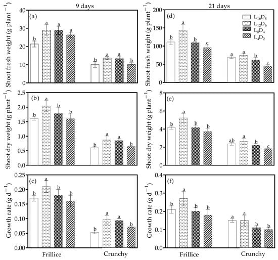 Shoot fresh weight (a,d), shoot dry weight (b,e), and growth rate (c,f) of lettuces (cv. Frillice and Crunchy) in response to different light/dark cycles on days 9 and 21 after transplanting. Different letters for the same parameter indicate significant differences at the 5% level, according to Duncan’s multiple range test (n = 5).
