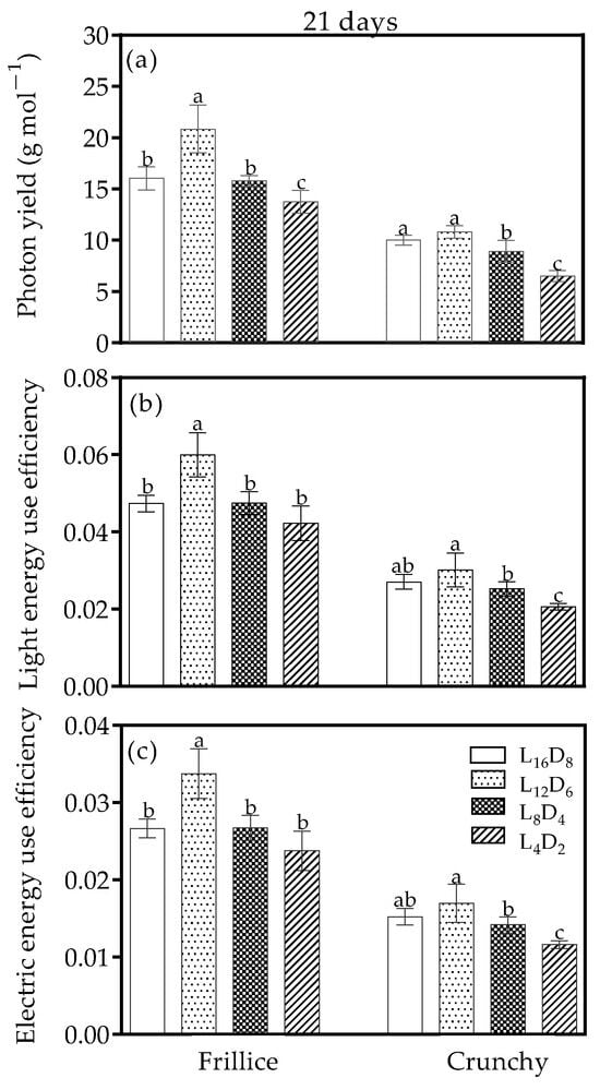 Photon yield (a), light energy use efficiency (b), and electric energy use efficiency (c) of lettuces (cv. Frillice and Crunchy) in response to different light/dark cycles on day 21 after transplanting. Different letters for the same parameter indicate significant differences at the 5% level, according to Duncan’s multiple range test (n = 5).