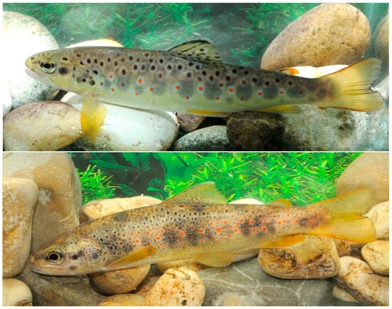- Caballero, P.; Morán, P.; Marco-Rius, F. A review of the genetic and ecological basis of phenotypic plasticity in brown trout. In Trout: From Physiology to Conservation; Polakof, S., Moon, T.W., Eds.; Nova Science: Hauppauge, NY, USA, 2013; pp. 9–26. [Google Scholar]