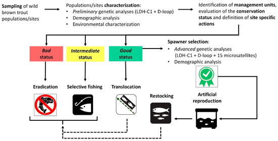 We typed individuals at the nuclear LDH-C1 gene and a 535 bp sequence of the mitochondrial D-loop for the preliminary genetic characterization of populations. Both markers are routinely used for a rapid, economically convenient and reliable assessment of hatchery introgression in wild trout populations in Italy as they unequivocally allow distinguishing between Mediterranean native and Atlantic alien alleles/haplotypes [17,18,32,46,47]. Laboratory procedures (DNA extraction, PCR amplification, genotyping of LDH-C1 and sequencing of the D-loop fragment) followed protocols described in Padula et al. [46] and Talarico et al. [47]. By combining LDH-C1 and D-loop profiles, we classified individuals into three genetic classes: “native” for individuals showing native profiles at the two markers; “alien” for individuals revealing Atlantic (hatchery) profiles at both LDH-C1 and D-loop; “introgressed” for individuals with admixed native-alien profiles (for further details, see Talarico et al. [47]). The population composition, in terms of frequency of genetic classes, was used to assist decision making for downstream conservation actions (see Figure 2 and “decisional workflow” section).