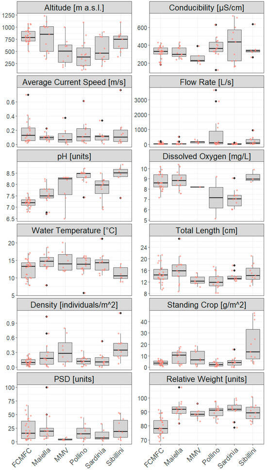 The two first PCA axes accounted for approximately 40% of the total variability (Figure 5). The first axis showed a positive correlation with pH, water temperature, conductivity and relative weight, and a negative relationship with dissolved oxygen. Conversely, the second axis indicated a positive relationship with both population abundance/density and average water speed. The distribution of sampling sites in PCA confirmed substantial environmental and demographic diversification within (e.g., Pollino and Sibillini) and among (e.g., Pollino and FCMFC) the pilot areas.