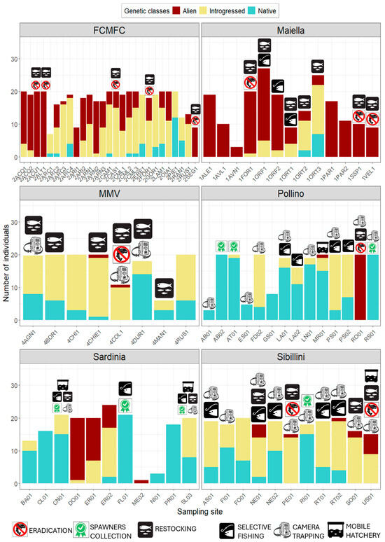 Bar charts depicting genetic class frequencies for 84 sampling sites of (Mediterranean) brown trout from six target areas in Italy. Selected sites for specific conservation actions (i.e., spawners collection, alien trout eradication, artificial reproduction in mobile hatchery, restocking with pure individuals, selective fishing, and camera trapping) were marked with symbols.