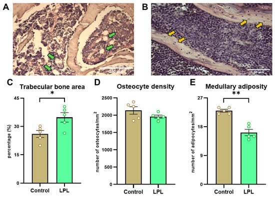 Interestingly, we observed that treatment with LPL increased the relative trabecular bone area compared to the animals in the control group. Furthermore, this treatment appeared to prevent bone marrow adiposity, as a higher number of adipocytes per unit area was found in the control animals. However, no significant differences were observed in terms of osteocyte density within the trabecular bone of the femur. Figure 1 includes representative photomicrographs of the proximal femur metaphysis from rats of the different groups.
