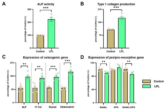Ex vivo effect of oral LPL treatment on the osteogenic differentiation potential of BMSCs. BMSCs were evaluated for the following: (A) alkaline phosphatase activity; (B) type I collagen production; (C) expression of osteogenic genes (ALP: alkaline phosphatase, t1 Col: type I collagen, Runx2: runt-related transcription factor 2); (D) expression of genes regulating osteoclastogenesis (RANKL: receptor activator of nuclear factor-κB-ligand; OPG: osteoprotegerin). Results are expressed as the mean ± SEM. Differences: ** p < 0.01, *** p < 0.001 vs. control.