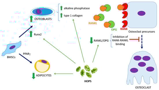 Osteoprotective effects of hops on bone marrow mesenchymal stem cells (BMSCs) differentiation and bone metabolism. Hops promote BMSCs’ differentiation toward the osteoblastic lineage by upregulating Runx2 expression and activating the AMPK pathway, which leads to increased alkaline phosphatase activity and type I collagen production. Furthermore, hops decreases the RANKL/OPG ratio, which inhibits osteoclast formation and, consequently, reduces bone resorption. Runx2: runt-related transcription factor 2, PPARγ: peroxisome proliferator-activated receptor gamma, RANK: receptor activator of nuclear factor κB, RANKL: receptor activator of NFκB ligand, OPG: osteoprotegerin, BMSCs: bone marrow stem cells.
