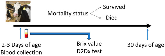 The D2Dx immunity test involves a single-step process with results obtained in less than 1 min. It can be readily conducted in farm settings. A recent study conducted on a calf ranch found a positive correlation (r = 0.61, p < 0.01) between the D2Dx immunity test scores and total serum protein measurement of newborn Holstein bull calves [16], suggesting the potential of the D2Dx immunity test for evaluating TPI. Because the D2Dx test measures the actual humoral immune response of an animal, we hypothesize that the blood D2Dx test score at 2–3 days of age may be a better indicator of calf mortality risk compared with Brix values. The study objective was to compare the ability of Brix values and D2Dx test scores to measure the immune status of dairy calves following TPI and to predict the mortality risk of calves within one month of age. Knowing the true immune status of neonatal calves will help farmers find more effective immune modulation products and management solutions to reduce calf mortality and financial losses.