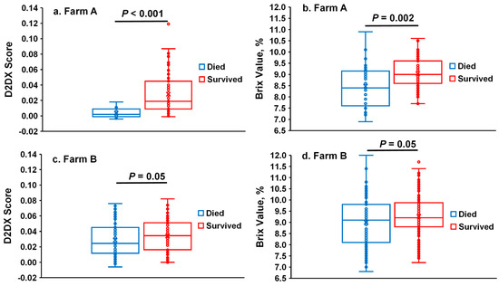 The D2Dx scores and Brix values of calf serum samples collected at 2–3 days of age were compared between calves that survived or died later. On Farm A, calves that survived their first 30 days of life had a greater serum Brix value (mean values: 9.05 vs. 8.48, respectively; p = 0.002) and D2Dx score (0.0281 vs. 0.0036, respectively; p < 0.001) at 2–3 days of age than calves that died at 3–30 days of age. However, as shown in the box–whisker plot (Figure 2a), the D2Dx scores of the calves that died later on Farm A displayed a narrow range of variability while the D2Dx scores of the calves that survived had a wide range of variability. In contrast, the Brix values of both groups of calves had a wide range of variability (Figure 2b). On Farm B, calves that survived up to 30 days of age also had greater serum Brix values (9.26 vs. 8.99, respectively; p = 0.05) and D2Dx scores (0.0342 vs. 0.0286, respectively; p = 0.05) compared with the calves that died. However, the D2Dx scores and Brix values of both groups of calves exhibit wide ranges of variability (Figure 2c,d). For both farms, regardless of the mortality status, D2Dx scores were significantly and positively associated with Brix values (Farm A: Spearman’s ρ = 0.42, p < 0.001; Farm B: Spearman’s ρ = 0.42, p < 0.001). This finding is similar to what has been previously reported by Casper [16].
