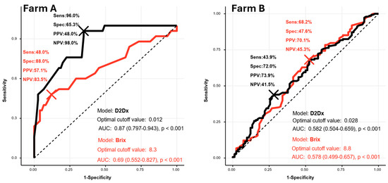 The Receiver Operating Characteristic (ROC) curves and Area Under the Curve (AUC) values of the D2Dx-based and Brix-based predictive models used on farms A and B. The sensitivity (Sens = [true positive]/[true positive + false negative]), specificity (Spec = [true negative]/[true negative + false positive]), positive predictive value (PPV = [true positive]/[true positive + false positive]), and negative predictive value (NPV = [true negative]/[false negative + true negative]) were calculated.