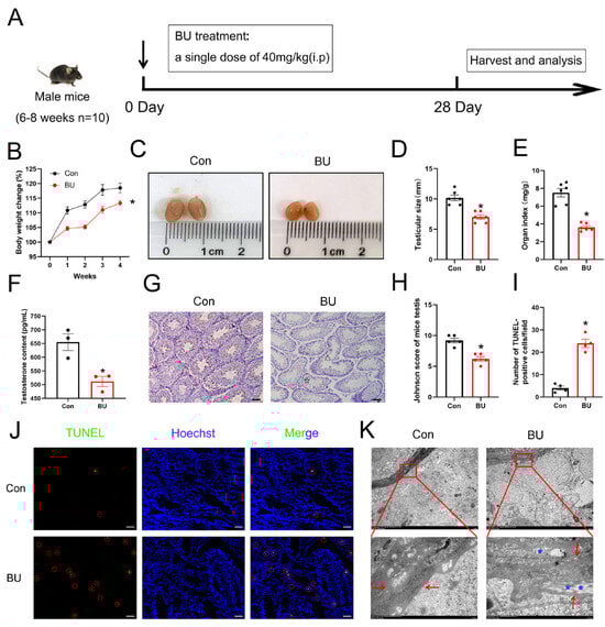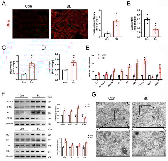 3.2. BU Exposure Leads to Ferroptosis in Mouse Testes