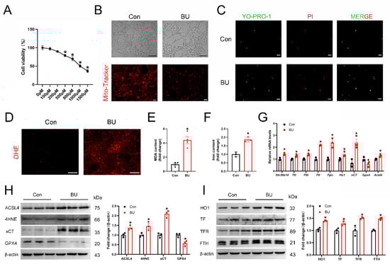 3.3. BU Reduces Cell Viability and Induces Ferroptosis in GC-1 Spg Cells