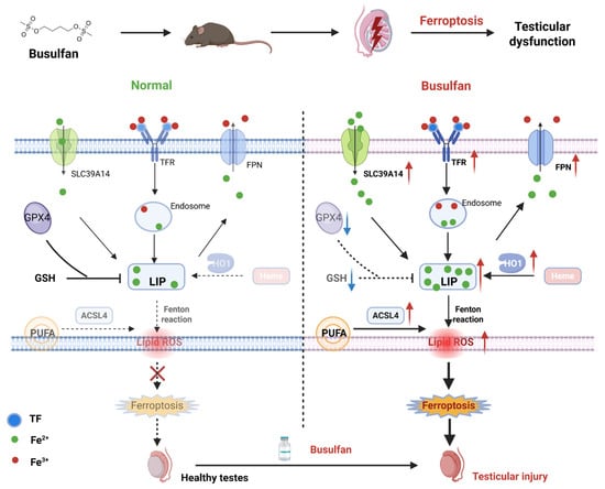 Hu, H.; Yuan, W.; Wang, Y.; Dong, Z.; Chen, G. Ferroptotic Pathway Activation in Spermatogonia: A Novel Mechanism of Busulfan-Induced Testicular Injury. Biology 2025, 14, 594. https://doi.org/10.3390/biology14060594