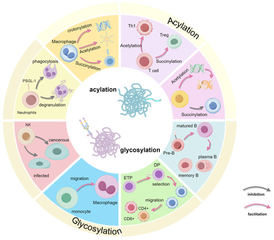 Similar to glycosylation, acylation can occur with or without enzymes, with enzymatic acylation being the more common mechanism. In this process, acyltransferases add acyl groups from coenzyme A to amino acids like lysine, glycine, cysteine, or serine on proteins, while deacylases remove them [52]. The acylation can be divided into crotonylation, malonylation, succinylation, lauroylation, and both short- and long-chain fatty acid modifications, such as myristoylation and palmitoylation [53]. In this section, acylation-based modifications are introduced, such as acetylation and two novel acylation modifications—succinylation and crotonylation—to show the effects of acylation on immune cells (Table 2).