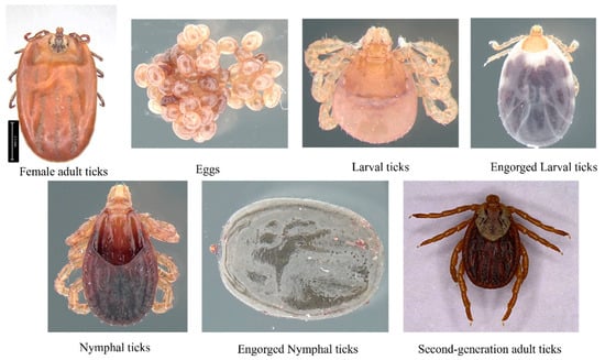 - Zhao, L.; Ma, Y.M.; Yang, B.; Han, W.X.; Zhao, W.H.; Chai, H.L.; Zhang, Z.S.; Zhan, Y.J.; Wang, L.F.; Xing, Y.; et al. Comparative analysis of microbial communities in different growth stages of Dermacentor nuttalli. Front. Vet. Sci. 2022, 9, 1021426. [Google Scholar] [CrossRef] [PubMed]