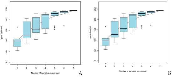 Species accumulation curves of Dermacentor nuttalli from the two regions: (A) shows the species accumulation curve for D. nuttalli from Ordos, and (B) shows the curve for D. nuttalli from Hinggan League. + represents outlier.