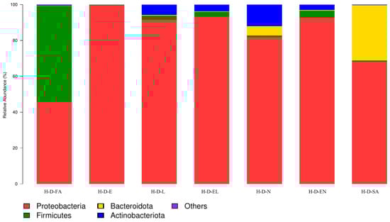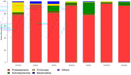 O-D and H-D were co-annotated to eight and sixteen bacterial phyla, respectively. Across all developmental stages in both regions, four common phyla were consistently identified (Figure 4 and Figure 5). Proteobacteria was the dominant phylum in all developmental stages of O-D and also predominated in H-D, except in H-D-FA, where Firmicutes was more abundant. Proteobacteria had the highest total relative abundance among bacterial phyla in both regions—88.1% in O-D and 81.7% in H-D (Table 3).