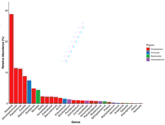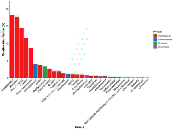 O-D and H-D samples were co-annotated to 145 and 141 bacterial genera, respectively. The most abundant genera overall were Arsenophonus (18.31%) and Rickettsia (28.83%). In O-D, 18 of the 30 most abundant genera belonged to Proteobacteria, whereas in H-D, 19 were classified under Proteobacteria. In total, 15 and 16 genera had relative abundances greater than 1% in O-D and H-D, respectively. Across the seven developmental stages, 19 genera were annotated in O-D and 16 in H-D. The top five most abundant genera in O-D and the top four in H-D all belonged to Proteobacteria (Figure 6 and Figure 7). The dominant genera varied across developmental stages and between the two regions (Table S1).