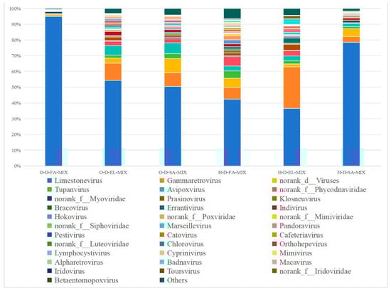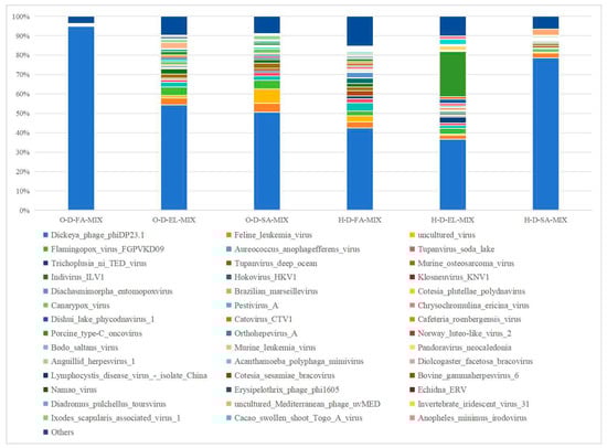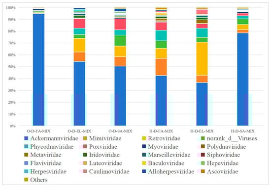 O-D and H-D samples were annotated to 25 and 28 viral families, respectively (Figure 8). Among them, three pooled samples from each region shared 16 and 13 viral families, respectively. Additionally, O-D-FA-MIX and O-D-EL-MIX were co-annotated with five viral families, namely, Ascoviridae, Baculoviridae, Caulimoviridae, Metaviridae, and Polydnaviridae; H-D-EL-MIX and H-D-SA-MIX were also co-annotated with seven viral families, namely, Asfarviridae, Caulimoviridae, Geminiviridae, Iflaviridae, Marseilleviridae, Metaviridae, and Polydnaviridae; H-D-FA-MIX and H-D-SA-MIX were co-annotated with five viral families, namely, Ascoviridae, Hepeviridae, Phenuiviridae, Siphoviridae, and norank_o_Caudovirales; and O-D-FA-MIX and O-D-SA-MIX were co-annotated with norank_o_Caudovirales.