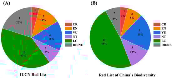 Conservation status of 25 amphibian species in Tangjiahe National Natural Reserve, western China. (A) IUCN criteria; (B) Red List of China’s Biodiversity.
