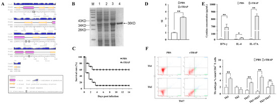 To determine whether the recombinant proteins were immunogenic, separate groups of mice were immunized with the recombinant proteins or controls (PBS mixed with an equal volume of adjuvant). As shown in Figure 1C, rTRAP increased the survival rates of the infected, vaccinated mice by 60% on day 14 post-infection. CD4+ T cells are critical cellular compartments for antibacterial immunity and cell proliferation, and the cytokine profiles of CD4+ lymphocytes isolated from the spleens of TRAP-immunized mice were determined. CD4⁺ T cells from TRAP-immunized mice exhibited a higher stimulation index compared to those from the control group (Figure 1D). Moreover, the cytokine secretion level of IFN-γ and IL-17A in immunized mice was significantly higher compared to the PBS controls (Figure 1E, p < 0.01). To further elucidate contribution of the antigens to T cell differentiation, TRAP-induced lymphocytes were harvested after culturing for one week for CD4+ T cell polarization tests in vitro. After stimulation, the TRAP group had more Th1 and Th17 cells than the control group (Figure 1F). Thus, immunization with TRAP induced strong Th1-type responses and Th17 responses.
