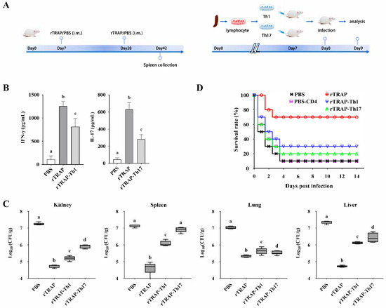 TRAP-induced Th1/Th17 immune responses confer protection against S. aureus. (A) Experimental design for adoptive transfer. BALB/c mice were intravenously injected with 1 × 106 rTRAP-induced Th1 or Th17 cells prior to infection with 2 × 108 CFU of S. aureus Newman. (B) The cytokine profile of CD4+ lymphocytes isolated from the spleens of the transferred mice. (C) Bacterial burden in target organs. (D) The survival rate of the transferred mice after challenge. rTRAP, rTRAP-immunized group; PBS, PBS-immunized group; rTRAP-Th1, recipients of Th1 cells from rTRAP-immunized donors; rTRAP-Th17, recipients of Th17 cells from rTRAP-immunized donors; PBS-CD4, recipients of CD4⁺ T cells from PBS-immunized donors. Different letters indicate significant differences between various treatments (p < 0.05).
