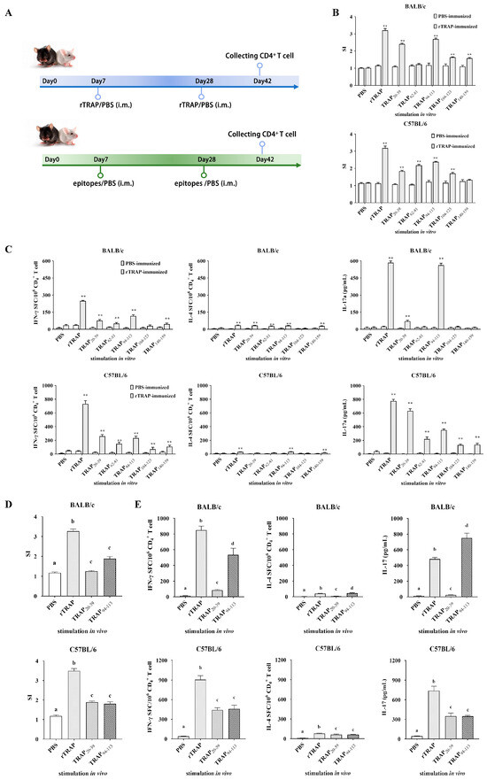 Identification of TRAP-induced CD4+ T cell epitopes. (A) Scheme for identification of TRAP-induced CD4+ T cell epitopes. (B,C) Proliferation and cytokine secretion by CD4⁺ T cells from rTRAP-immunized BALB/c and C57BL/6 mice incubated with TRAP peptides. (D) CD4⁺ T cell proliferation in response to peptide stimulation. Cells from immunized mice or PBS controls were cultured with the indicated peptides. Proliferation was measured via CCK-8 assay. (E) Immunogenicity of candidate epitopes (TRAP20–39 and TRAP94–113) in BALB/c and C57BL/6 mice. Different letters and asterisks indicate statistical significance. Letters: different superscript letters of any two groups indicate significant differences (p < 0.05); asterisks: ** p < 0.01.