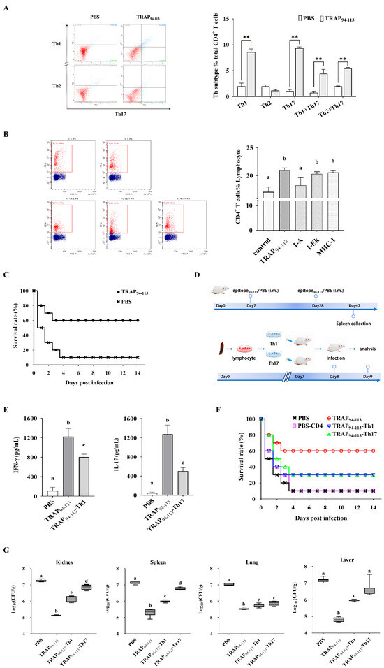 Immunogenic characterization of TRAP94–113 epitope. (A) Phenotypic analysis of CD4+ T cells after immunization with TRAP94–113 epitope. (B) MHC class II-restricted epitope validation. Flow cytometry plots (Left). Proliferation analysis (Right). (C) The survival rate of BALB/c mice vaccinated with TRAP94–113 epitope after challenge. (D) Adoptive transfer protocol. (E) IFN-γ and IL-17A levels in CD4⁺ T cells form transferred mice. (F) Organ bacterial loads. (G) Survival rates of the transferred mice after challenge with S. aureus. TRAP94–113, TRAP94–113 epitope-immunized group; PBS, PBS-immunized group; TRAP94–113-Th1, recipients of Th1 cells from TRAP94–113 epitope-immunized donors; TRAP94–113-Th17, recipients of Th17 cells from TRAP94–113 epitope-immunized donors; PBS-CD4, recipients of CD4⁺ T cells from PBS-immunized donors. Different letters and asterisks indicate statistical significance. Letters: different superscript letters of any two groups indicate significant differences (p < 0.05); asterisks: ** p < 0.01.